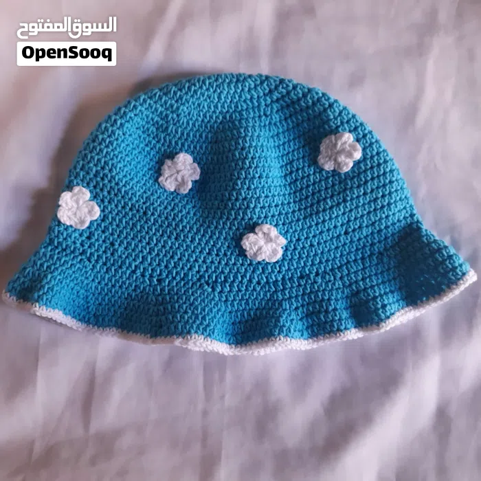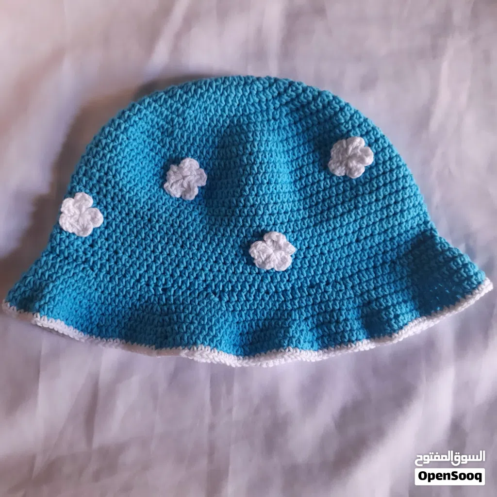 handmade crochet light blue bucket hat with white cloud appliques adult size
